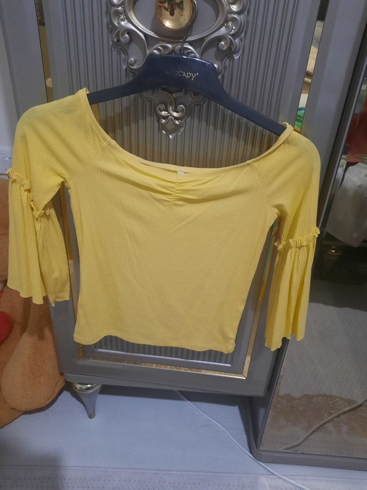 Sarı kayık yaka bluz, uzun pilili kollar ve bol kesimle, sentetik kumaştan üretilmiştir. Günlük sokak stili için uygun. Madonna yaka