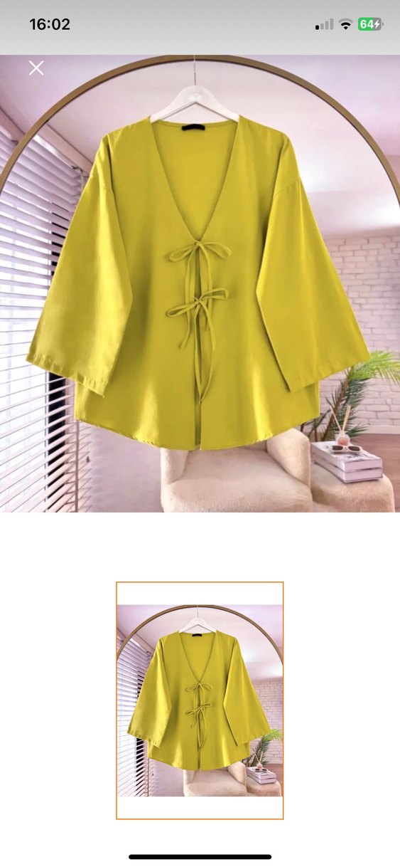Parlak sarı renkte, bol kesim, uzun kollu ve V yakalı mini kimono. Düğmeli detaylara sahip, sentetik kumaştan üretilmiştir.