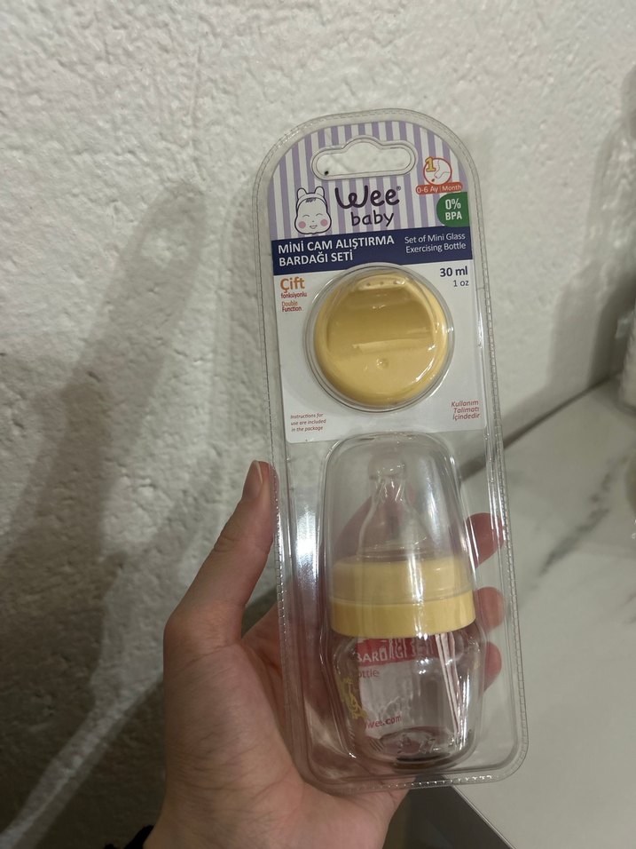 Pastel sarı renkte, 30 ml kapasiteli, BPA içermeyen mini cam bebek bardak seti. İki parçadan oluşur ve yumuşak emziklidir.