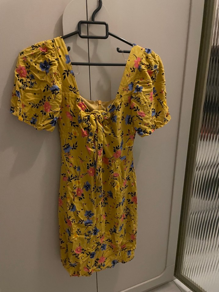 Dar kesim, hafif sarı sentetik kumaştan yapılmış, çiçek desenli, V yakalı, kabarık kollu ve fırfır detaylı mini elbise, romantik akşamlar için uygun.