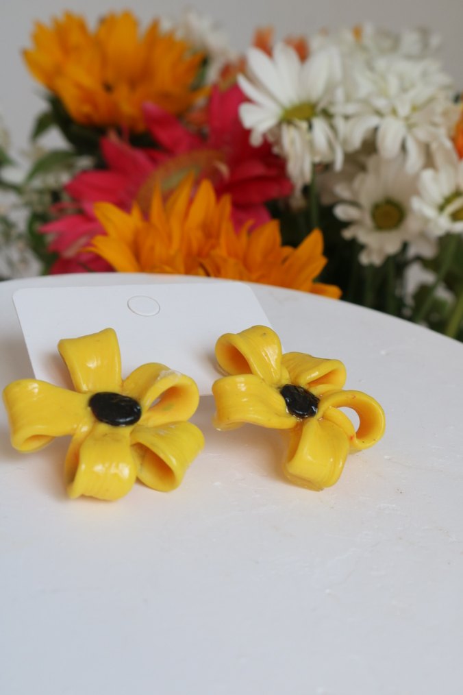 Parti için kısa, mini boyda, sarı renkli, çiçek desenli fiyonk şeklinde küpelerdir. Canlı renkleriyle dikkat çeker.