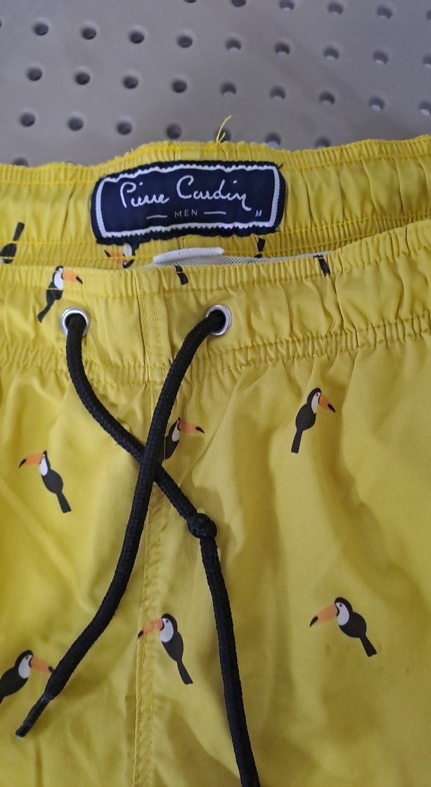 Sarı mini boy, kuş desenli, düğmeli erkek mayo şortu. Ayarlanabilir bağcıklı bel detayı ile plaj için uygundur. ️
