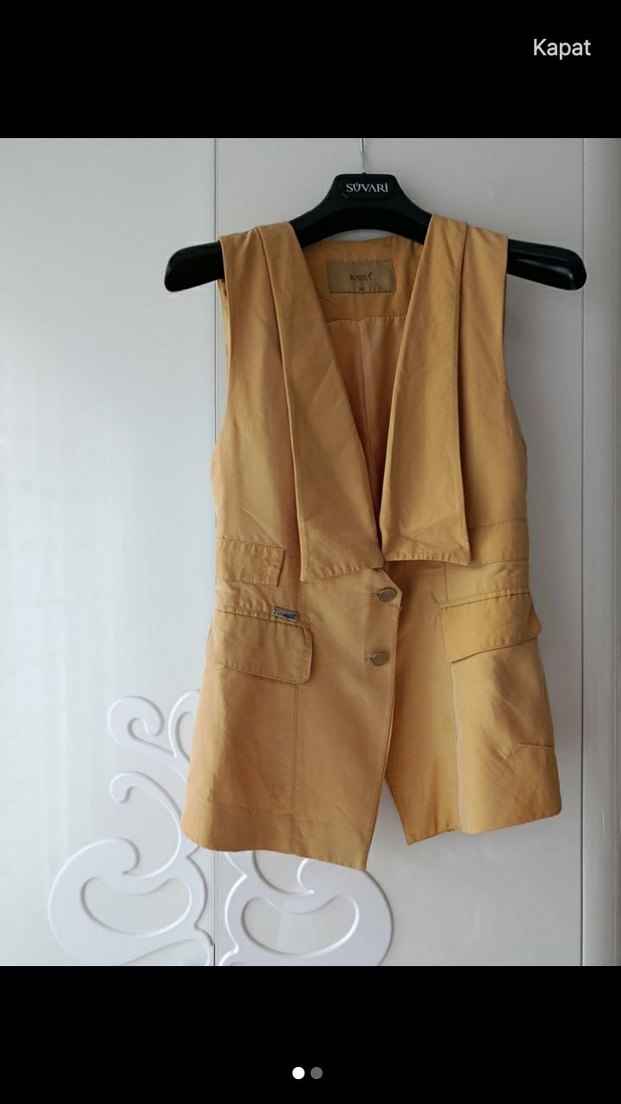 Düğmeli, yakalı ve kolsuz bu sarı yelek, parlak ve ipeksi kumaştan kısa kesim ve rahat bir kalıba sahiptir. Ofis ve günlük sokak stiline uygundur.