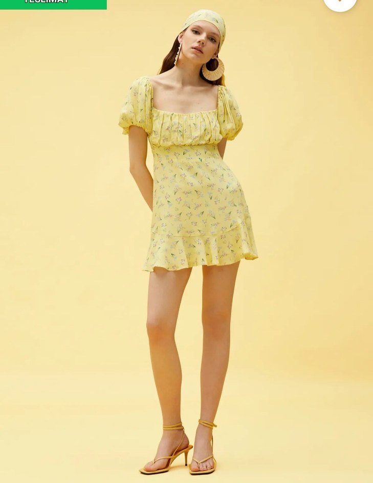 Sarı mini elbise, gevşek kesimli ve fırfırlı detaylıdır. Kısa kollu, askısız ve pastel tonlarda batik desenlidir. Parti için uygundur.