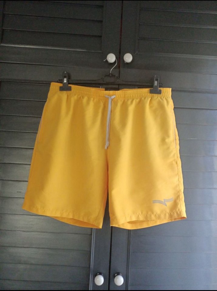Sarı renkli, kemerli ve bol kesim erkek deniz şortu. Düz ve parlak yüzeye sahip, plaj için uygun sokak stili şort.