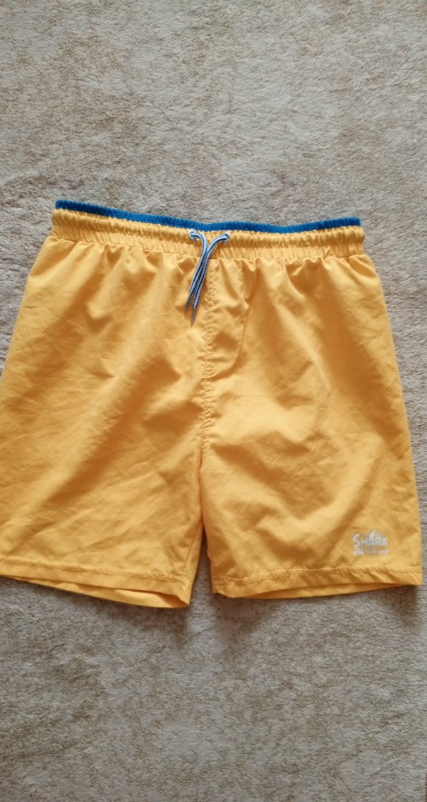 Sarı renkli, bol kesim ve kemerli erkek deniz şortu. Parlak dokusu ve sade deseniyle plajda kullanıma uygundur.