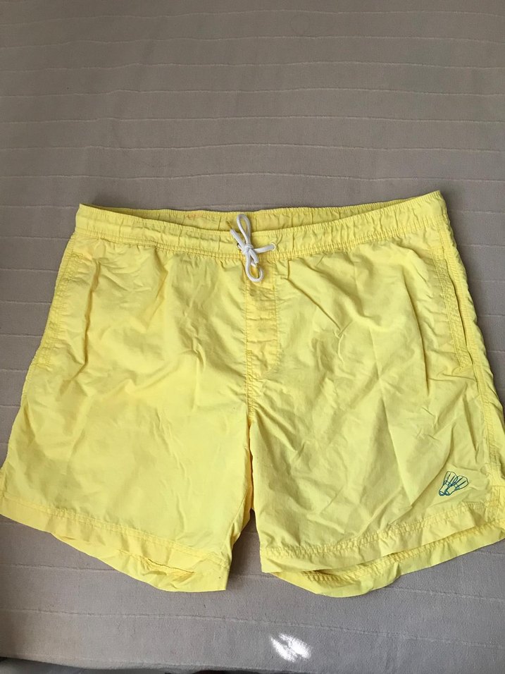 Rahat kesim, pastel sarı renkli, desen içermeyen kısa erkek deniz şortu, plaj ve günlük sokak stili için uygun.