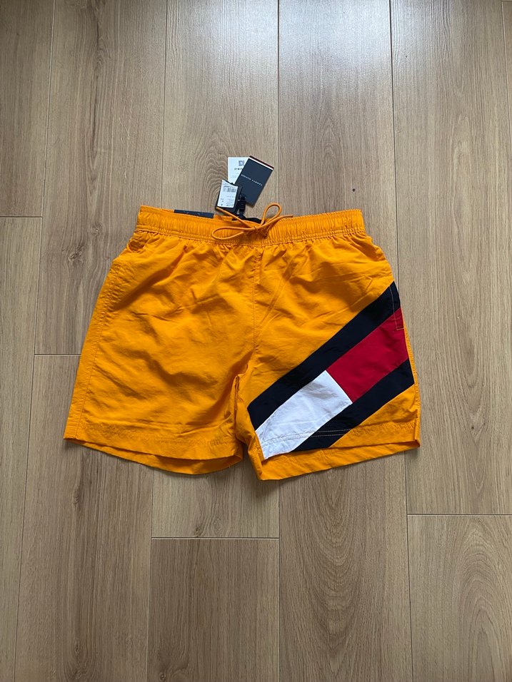 Sarı renkli, belden kemerli ve kırmızı, beyaz, siyah renk bloklu desen detaylı, bol kesim erkek plaj şortu. Plaj ve günlük kullanım için uygundur.