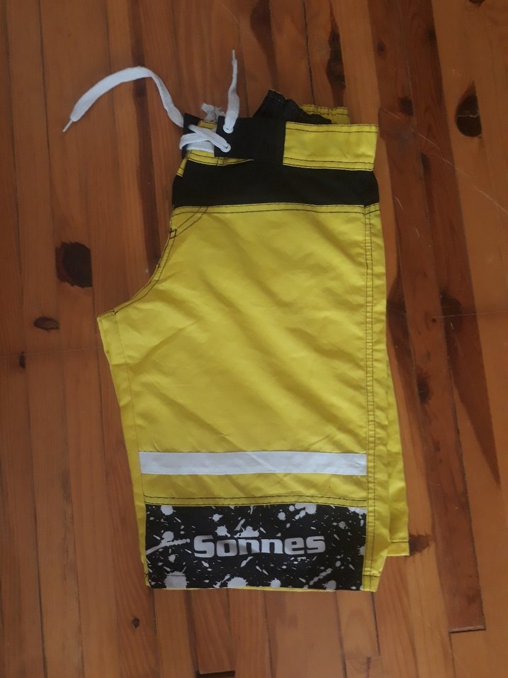Parlak sarı renkte, siyah baskılı desenli, kemerli ve dar kesim erkek mini spor mayo şortudur. Spor ve günlük kullanıma uygundur.