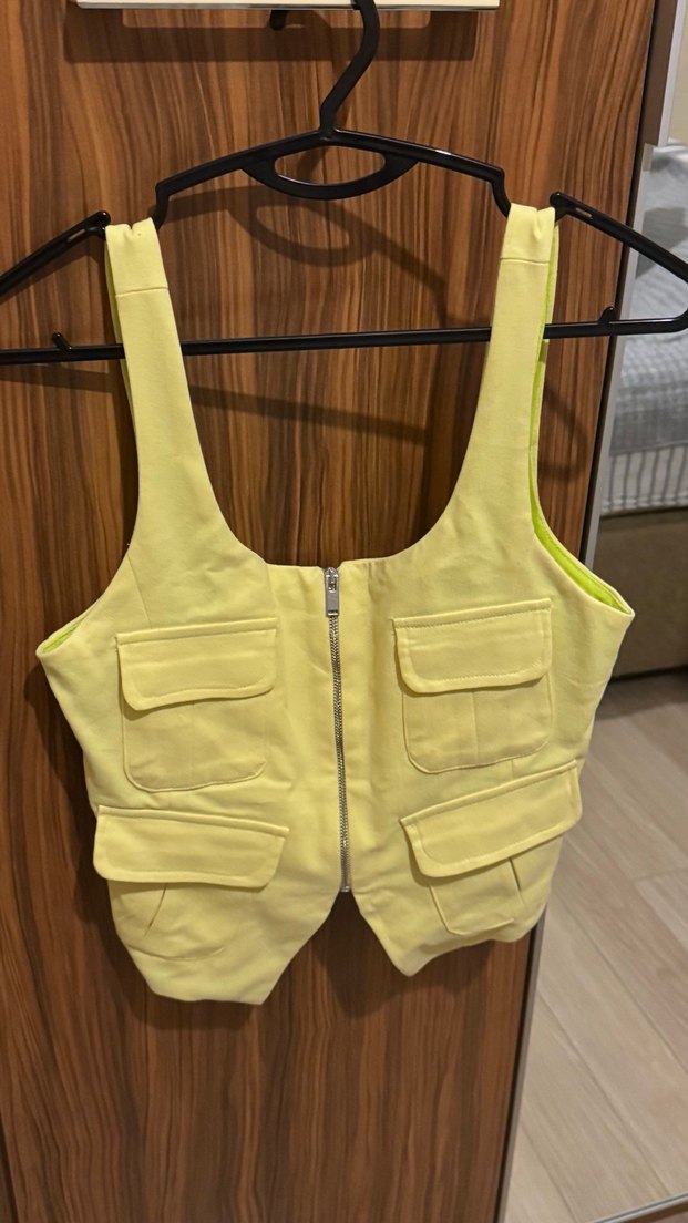 Sarı mini fermuarlı, önü dört cepli, sentetik kumaştan yapılmış, straplez ve vücuda oturan kadın yelek ve pantolon takımı Günlük sokak stili için uygundur.
