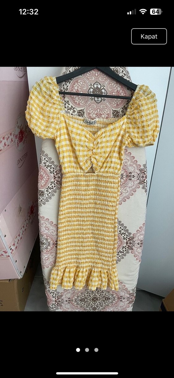 Sarı mini elbise, tekne yaka ve askılı kollara sahip. Fırfır detayları ve batik desenli, yumuşak kumaştan bohem tarzı elbise.