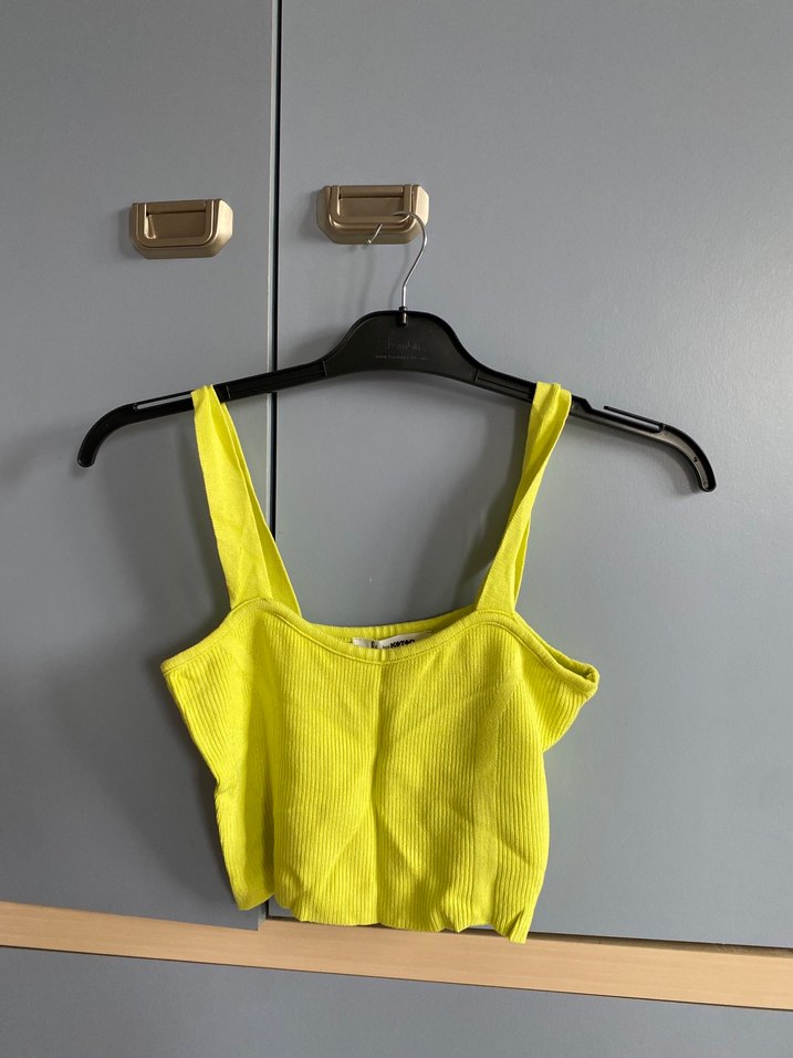 Sarı renkte, askılı, kısa ve fit kesim kadın atlet. Yumuşak sentetik kumaştan, rahat ve şık bir günlük kullanım ürünü.