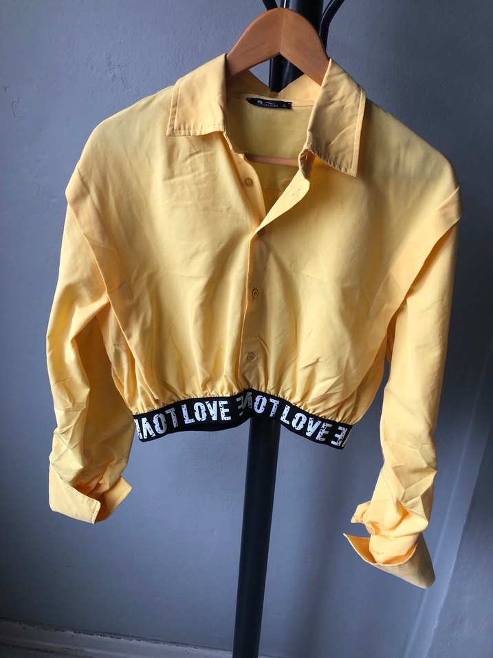 Sarı uzun kollu, düğmeli ve yakalı mini gömlek, bol kesim. Etek kısmında "LOVE" yazılı siyah baskılı lastik bulunur. Terikoton kumaştan, günlük rahat stil için uygun. Mağazamızın çekimlerinde kullanılan üründür.Çekim sonrası yıkanıp bu platformda uygun fiyata satışa sunulmuştur.