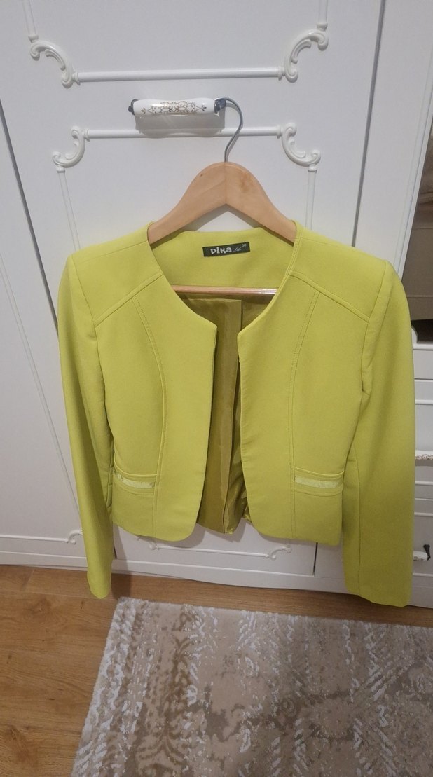Sarı mini kadın ceket, parlak sentetik kumaştan, uzun kollu ve düğmeli. Yakası notch detaylı, ofis ve sokak stiline uygun.