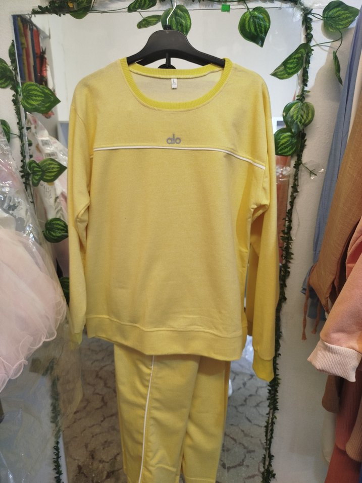 Sarı mini kadın eşofman takımı, bol kesim, uzun kollu ve yuvarlak yaka. Yumuşak, sıcak kumaştan, rahat sokak stili için uygundur. ✨