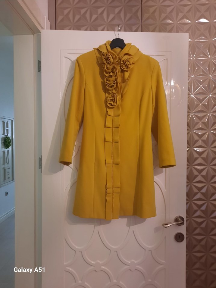 Sarı mini kaban, uzun kollu ve yaka kısmında fırfır detaylıdır. Rahat kesim ve modern klasik stilde olup ofis kullanımı için uygundur. Yumuşak ve sıcak kumaştan yapılmıştır.