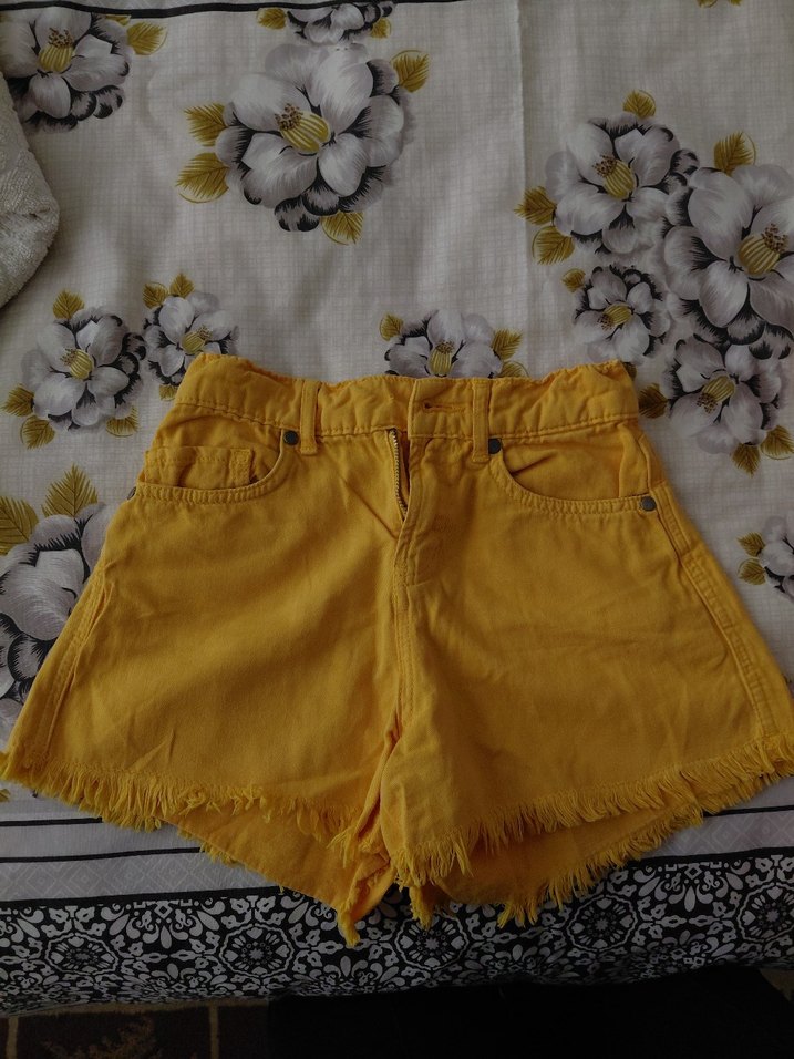 Sarı, düğmeli mini kadın şort. , günlük kullanıma uygun rahat bir model.