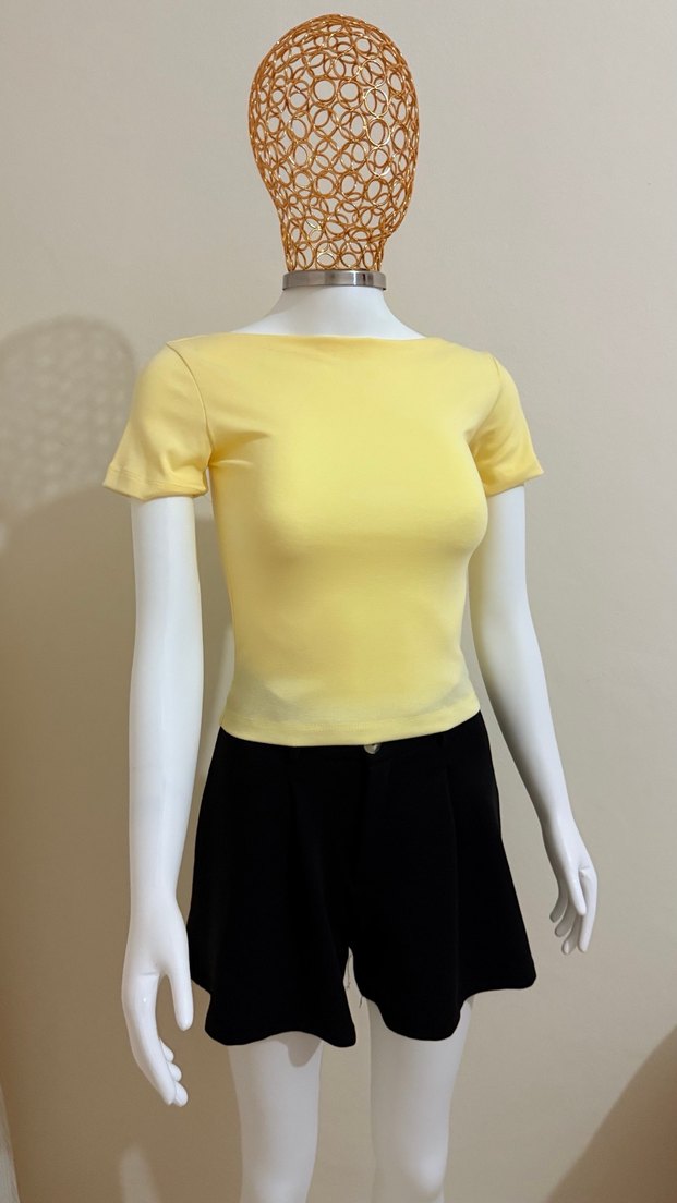 Kayık yakalı, kısa kollu, sarı mini kadın tişörtü. Düz renk, sentetik kumaştan, rahat ve şık günlük sokak stili için uygundur. (O kadar tok ve rahat bir kumaşı var ki bayıldımm )