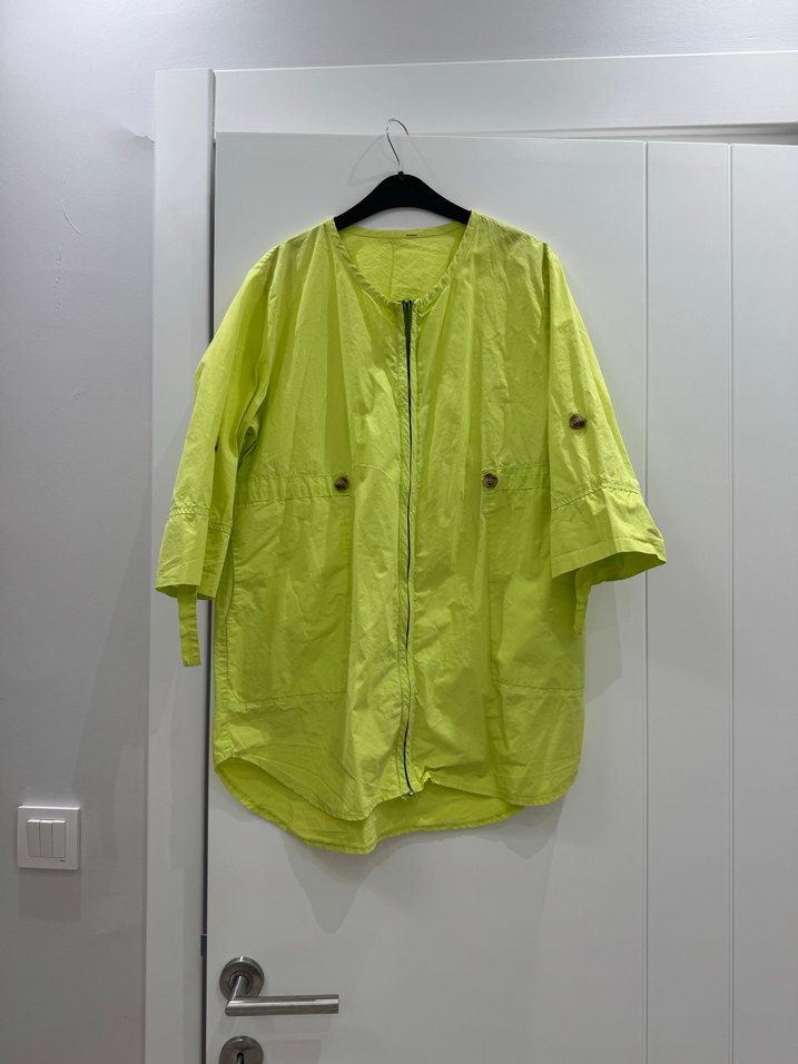 Düğmeli detaylara sahip, kısa kollu, yuvarlak yakalı, bol kesim sarı kadın yağmurluğu. arkadan sıkılabilir, kolları fakir koldur, bazı kalem lekesi mevcuttur ️