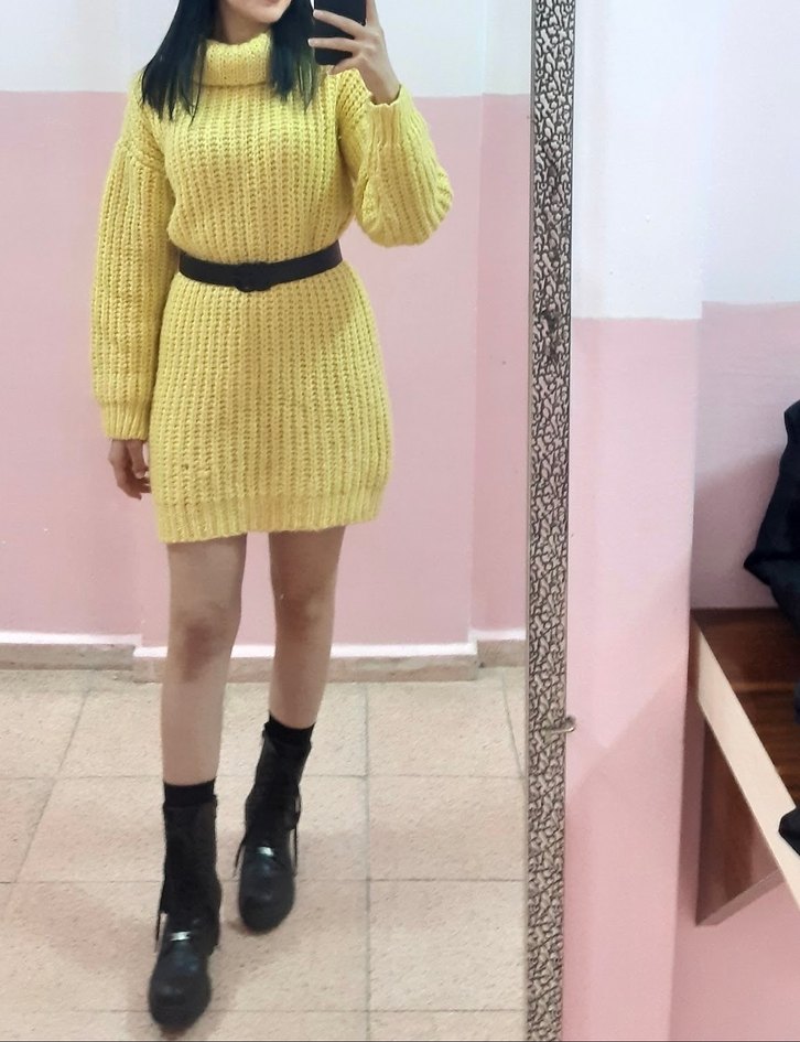 Pastel sarı renkli, örgü mini kazak elbise, bol kesim ve boğazlı yakaya sahiptir. Uzun kollu, rahat ve normcore tarzda günlük kullanım için uygundur. M/l uygundur