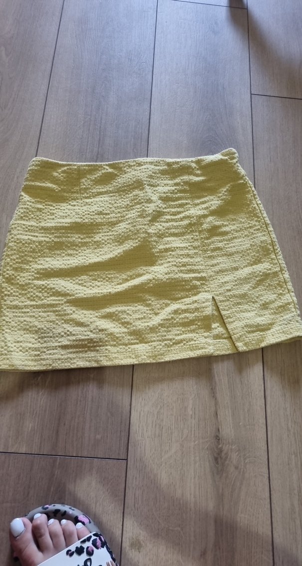 Pastel sarı renkte, keten kumaştan yapılmış, piliseli ve mini boy, vücuda oturan etek. Minimalist ve bohem tarzda, günlük kullanıma uygun.