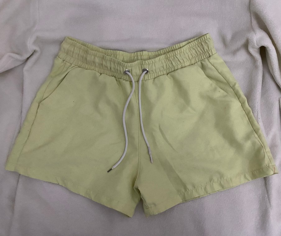 Bu sarı mini şortlar, elastik bel ve bağcıklı gevşek kesime sahip, yumuşak sentetik kumaştan üretilmiştir. Pastel tonuyla plaj için uygun.