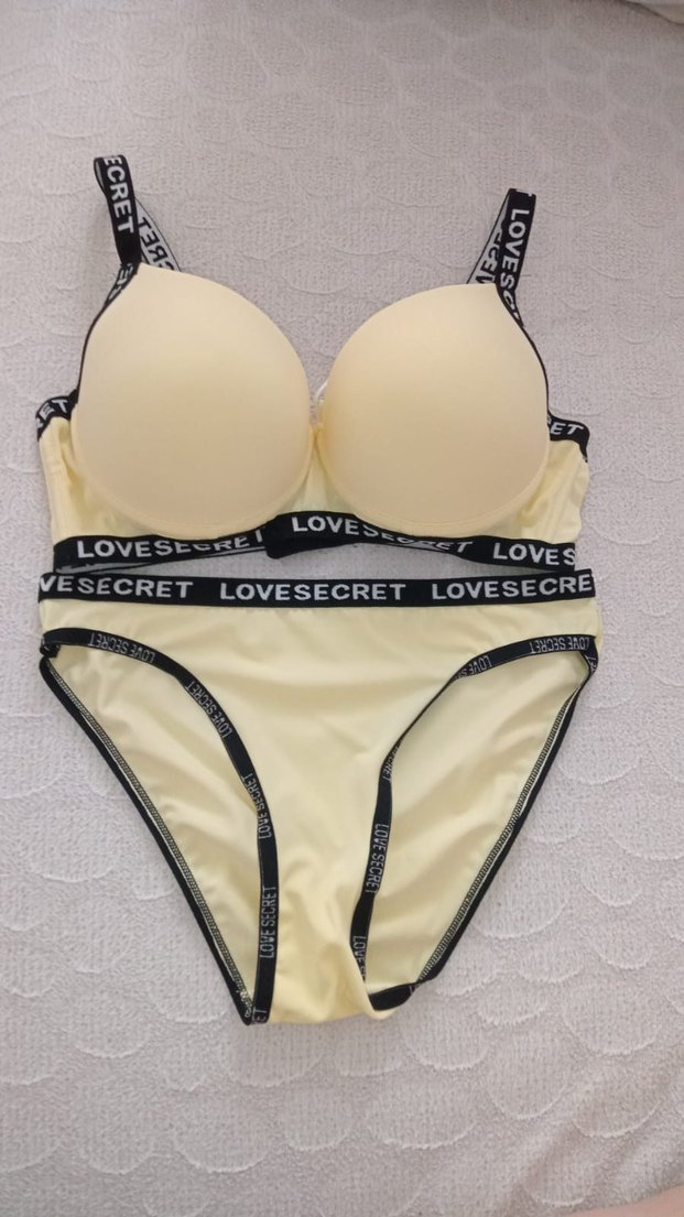 Sarı mini sütyen ve külot takımı, siyah 'LOVESECRET' baskılı askılarla spor ve sokak stili bir arada sunuyor.