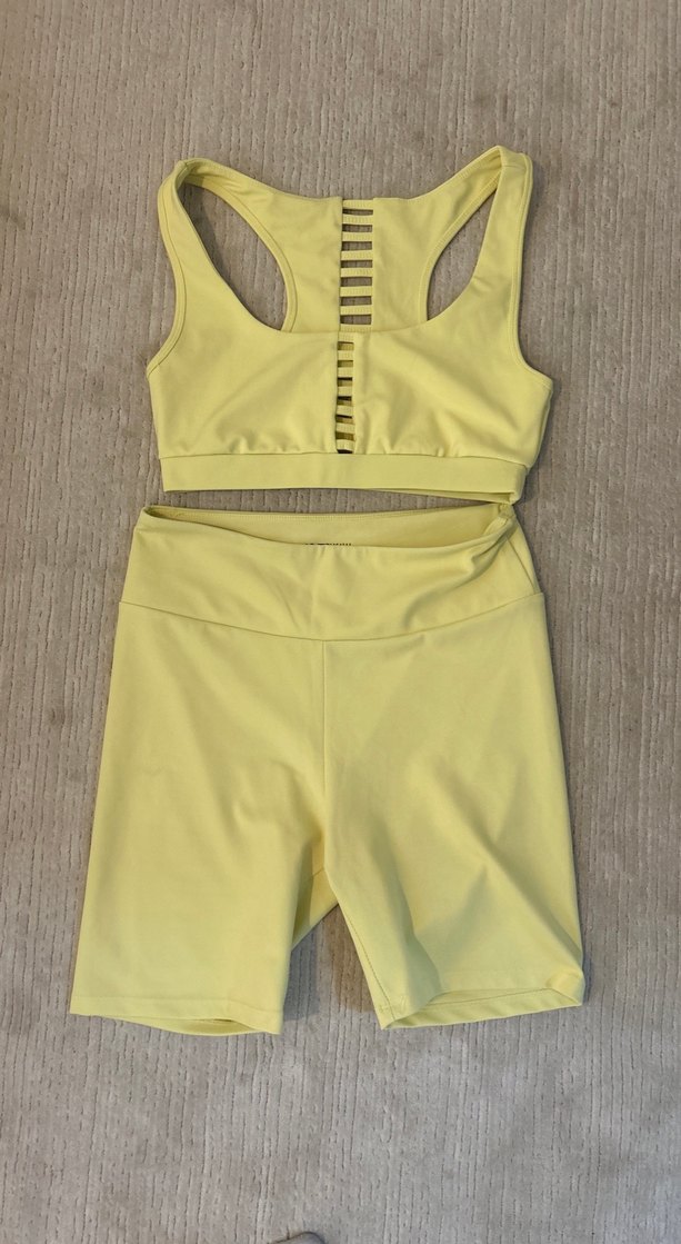 Sarı, askılı ve straplez üstü kesik detaylı, yüksek bel mini şortlu spor takımı. Pürüzsüz sentetik kumaştan, şık ve modern görünüm sunar.