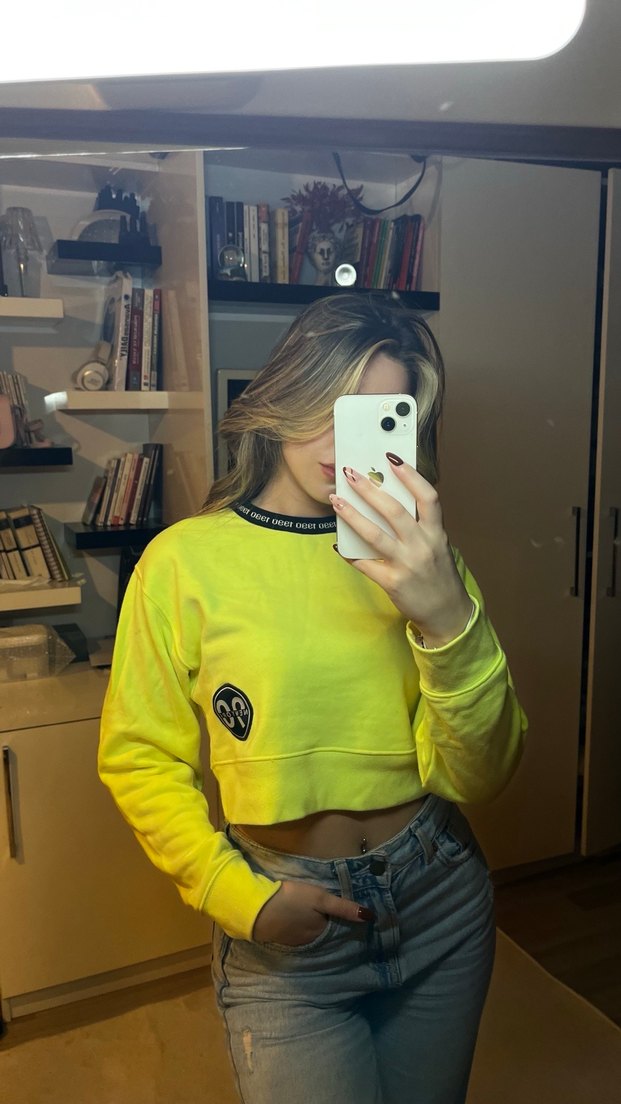 Sarı crop mini sweatshirt, uzun kollu ve bol kesim. Kısa boyu ve yumuşak kumaşıyla günlük rahat şıklık sunar.