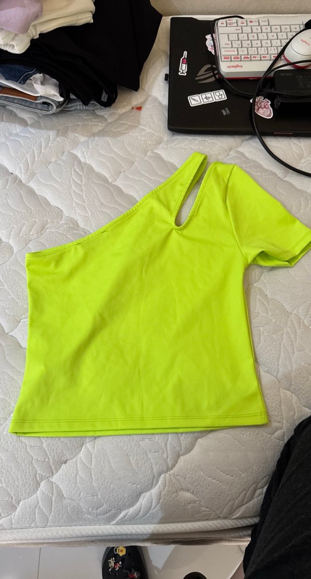 Bu dar kesim kadın üstü, tek omuz ve kısa kollu tasarıma sahiptir. Parlak sarı renkte, düz ve sentetik kumaştan üretilmiştir. Sokak stili ve dış mekan kullanımı için uygundur.
