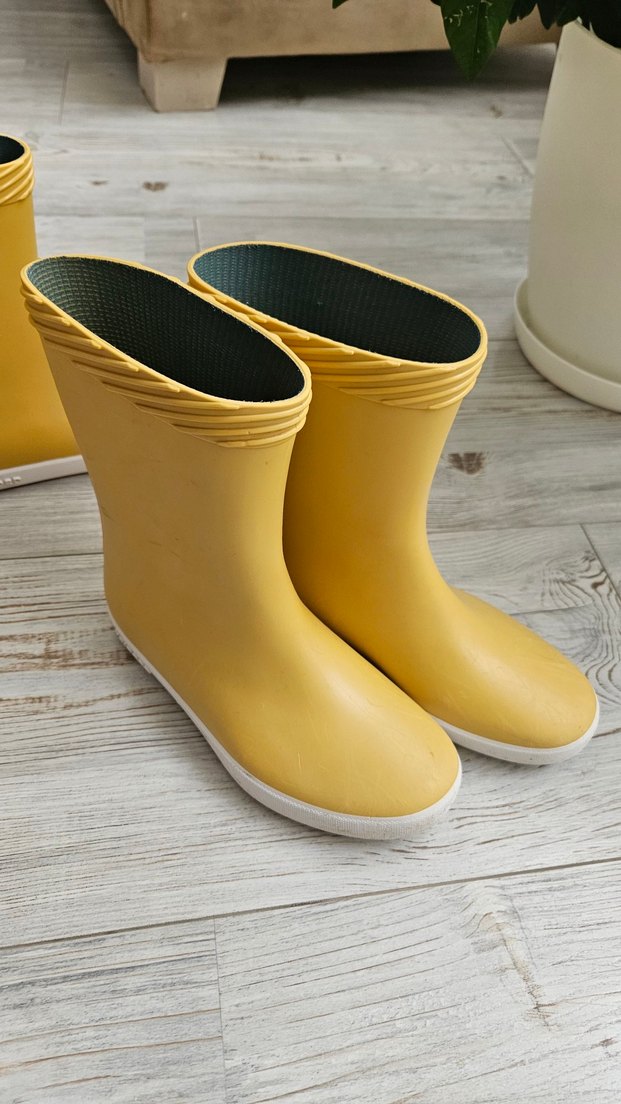 Sarı kauçuk yağmur çizmesi, minimalist tasarımlı ve ince topuklu. Pastel tonlarda, günlük kullanım için zahmetsiz şıklık sunar.