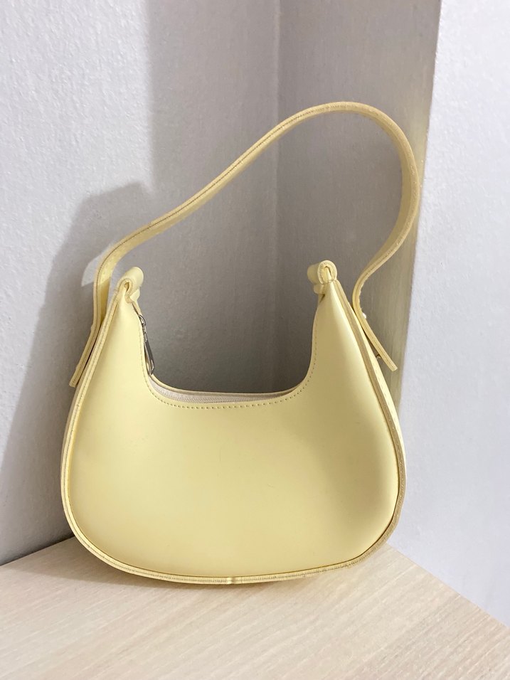 Modern klasik tarzda, pastel sarı renkte, deri ve desen içermeyen minimalist kadın çantası, günlük kullanıma uygundur.
