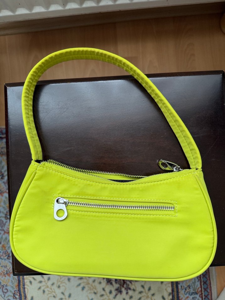 Sarı renkte, fermuarlı tasarıma sahip sentetik kumaş kadın çantası. Parlak yüzeyi ve minimalist tarzıyla stiline uygundur.