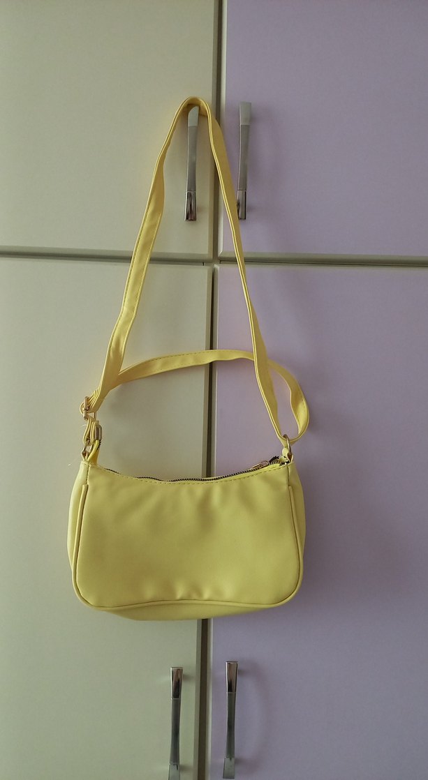 Sentetik kumaştan yapılmış, tokalı askılı pastel sarı omuz çantası. Günlük sokak stiline uygun sade, desensiz tasarım.