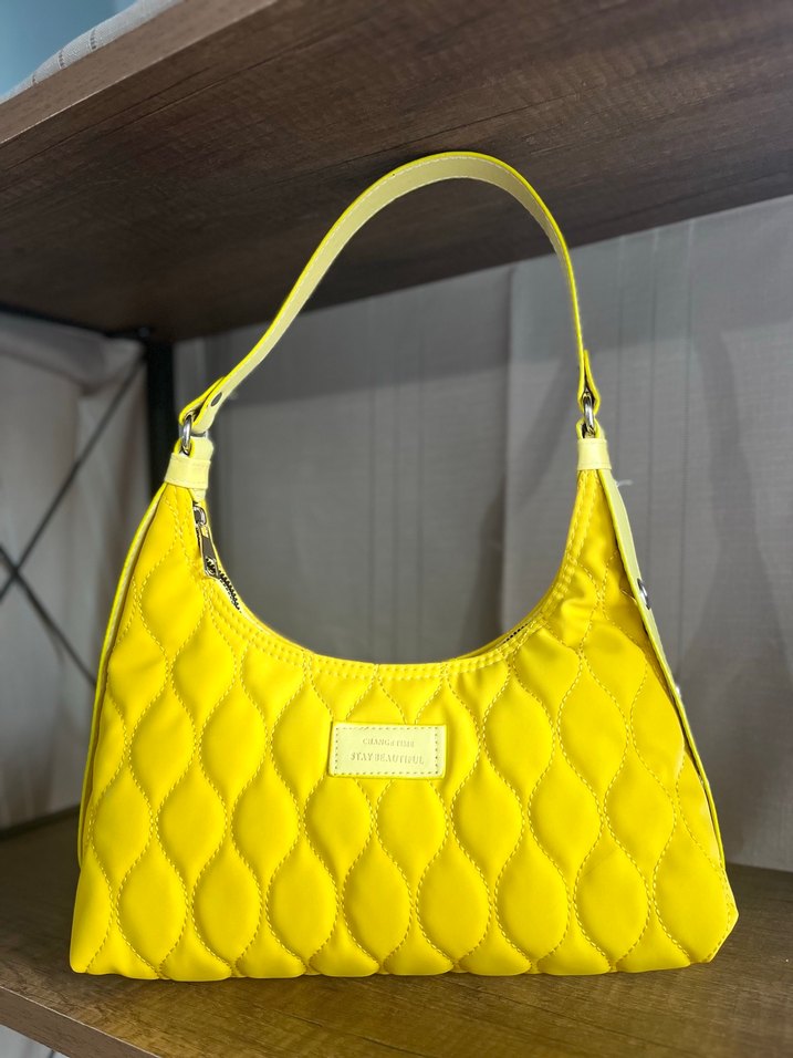 Parlak sarı sentetik kumaştan, fermuarlı ve kapitone desenli minimal kadın omuz çantası, cesur sokak stili için uygun. -sıfırdır-paketlidir