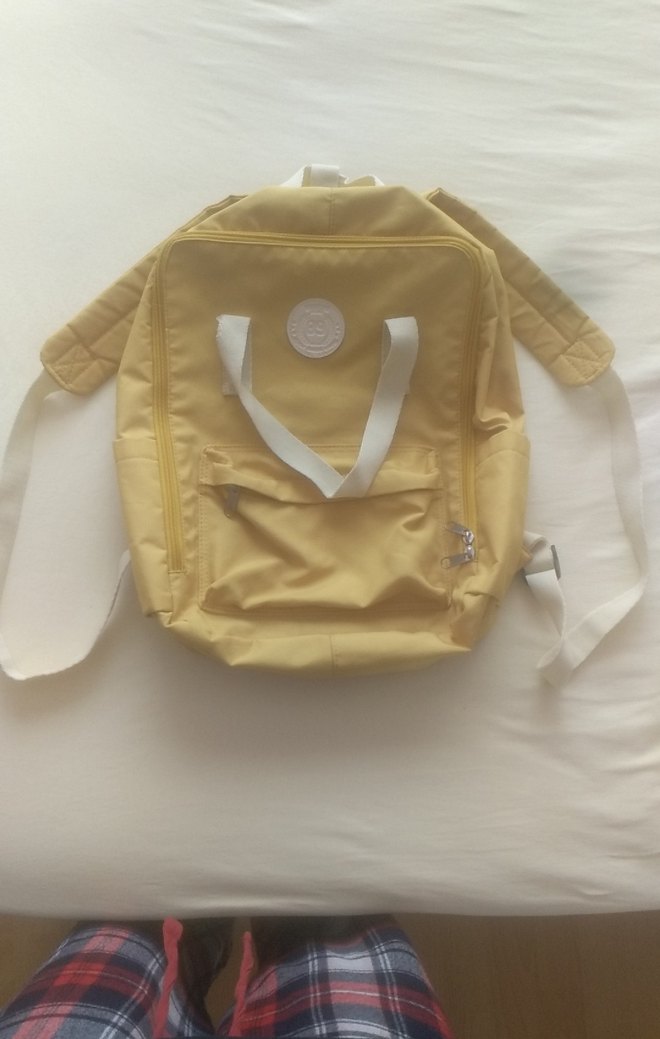 Pastel sarı renkte, baskılı ve fermuarlı ceplere sahip sentetik kumaş kadın sırt çantası. Beyaz askılarıyla günlük sokak stiline uygun.