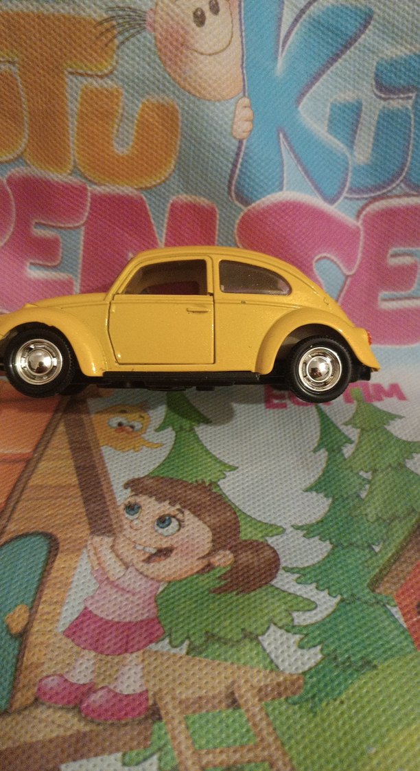 Pastel sarı renkte, klasik tasarıma sahip detaylı tekerlekli oyuncak araba.