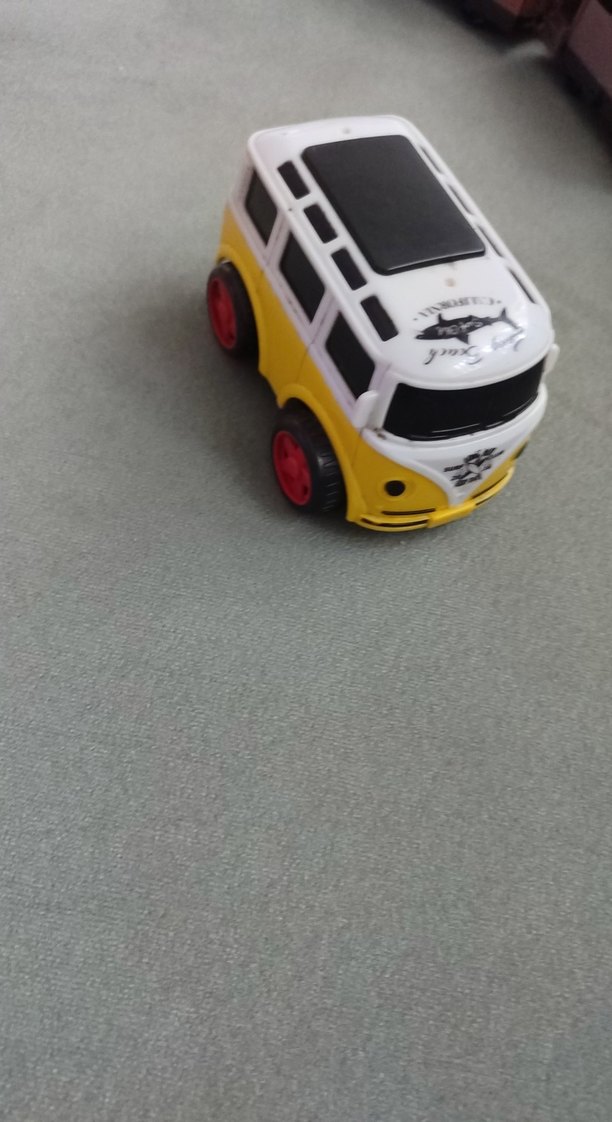 Sarı gövdesi, kırmızı tekerlekleri ve beyaz tavanı olan renkli oyuncak araba, oyun ve koleksiyon için uygundur.
