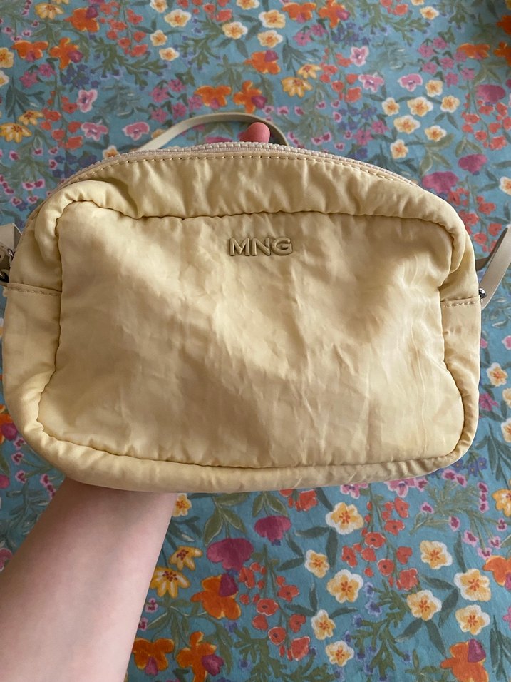 Pastel sarı renkte, fermuarlı, sentetik kumaştan MNG kadın makyaj çantası. Minimalist, desensiz tasarımı günlük kullanım için uygundur.