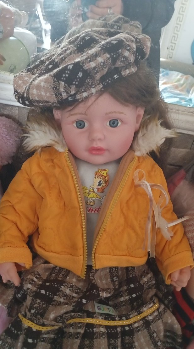 Sarı fermuarlı mont ve uyumlu kareli şapka ile pantolon giymiş renkli bebek. Mavi gözlü ve yumuşak saçlı.60 cm. lik vintage satışı olmayan bebek.