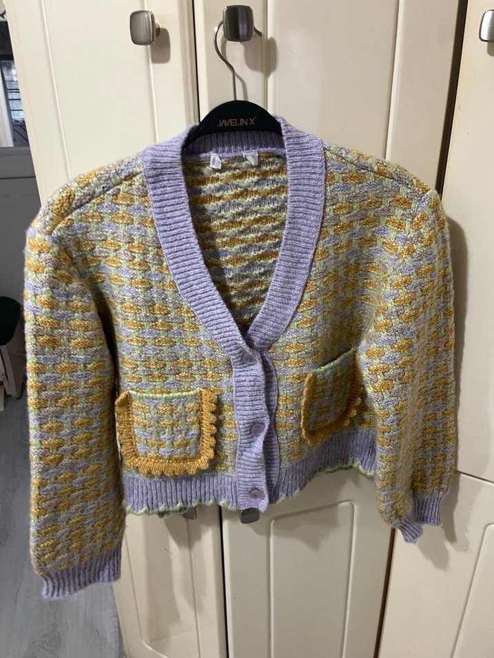 Sarı ve mor pastel tonlarda, desenli, cepli, uzun kollu, bol kesim bohem kadın hırkası.