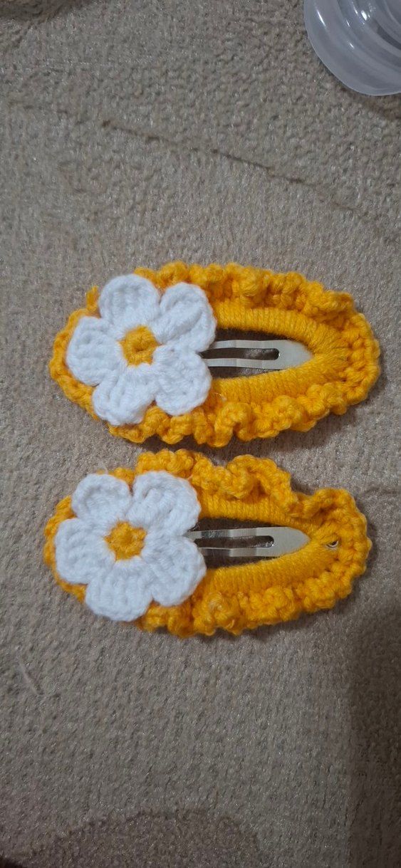 sarı mor turuncu renkler mevcut örgü malzemeden yapılmış, beyaz çiçek desenli iki adet çocuk saç tokası seti.