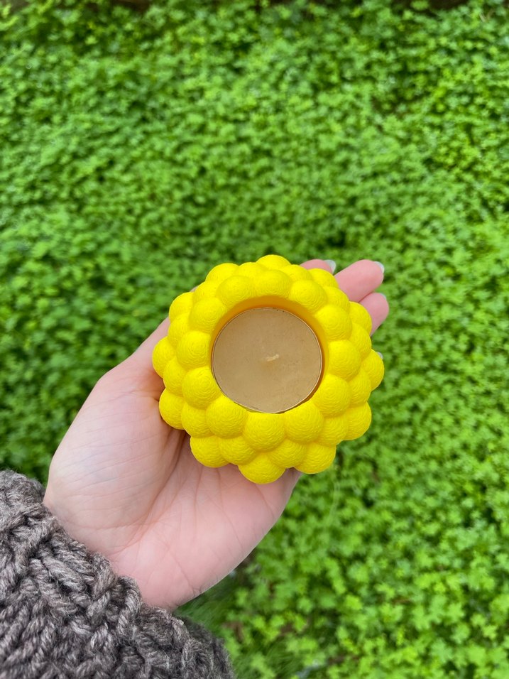 Bu renkli sarı mumluk, yuvarlak ve dokulu tasarıma sahiptir. Ortasında küçük bir mum tutar. 2li gönderim sağlanmaktadır. 3D yazıcı ile üretildi.