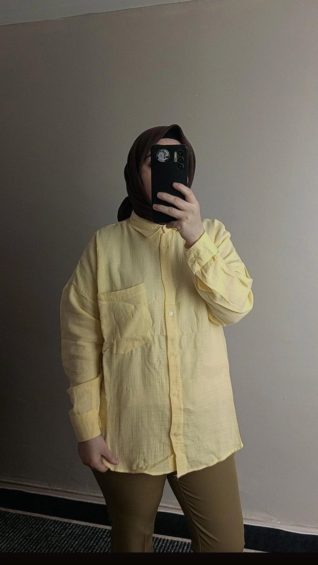 Açık sarı müslin gömlek, bol kesim ve yakalı, uzun kollu, desen içermeyen minimalist tasarımla günlük rahat kullanım için uygundur. s/m/L bedenler mevcut geniş kalıptır