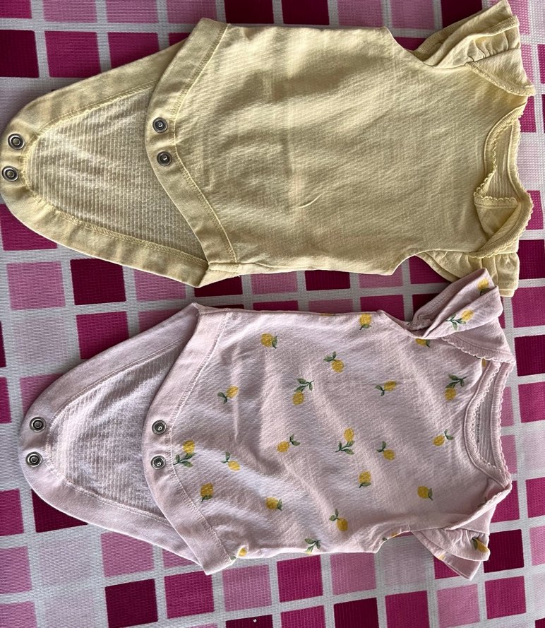 Askısız yakalı, sarı pastel renkli, nakışlı ve düğmeli bebek body. Kol kısmı kolsuzdur ve kolay giydirme sağlar. Çok sayılı kullanıldı