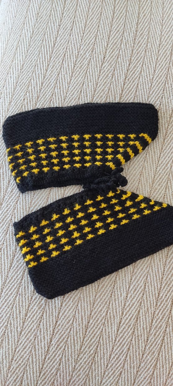 Koyu sarı ve siyah renklerde, nakışlı desenlere sahip elorgusu patik Rahat ve sıcak tutan tasarım.