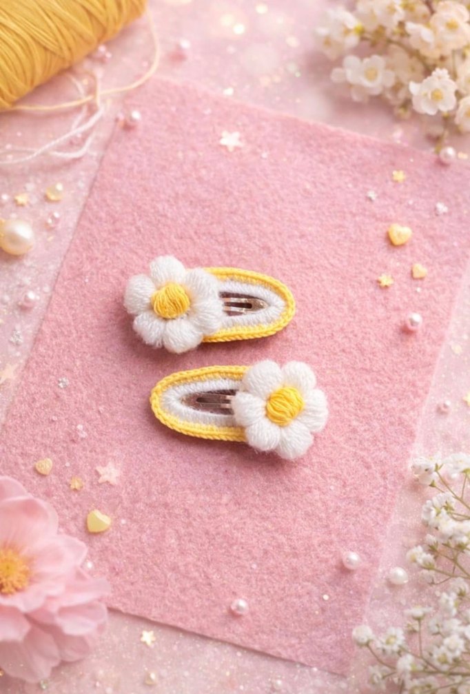 Sarı pastel renkte, nakışlı beyaz çiçek detaylı ve cırt cırtlı tokalar, bohem ve retro tarzını yansıtıyor.
