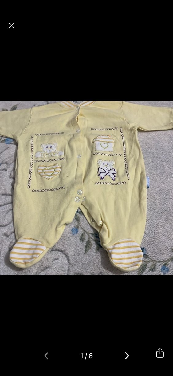 Pastel sarı renkte, uzun kollu ve düğmeli bebek tulumu. Yumuşak tüylü kumaştan üretilmiş, nakışlı ayıcık ve kalp desenleriyle süslenmiş. Ayaklı ve çizgili detaylara sahip. Sıkıntısı yoktur resımde gorundugu gıbıdır