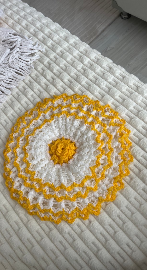 Renkli, sarı ve beyaz nakışlı yuvarlak desenlere sahip bohem tarzda mutfak havlusu. Yumuşak ve dekoratif, mutfakta kullanıma uygun. ️