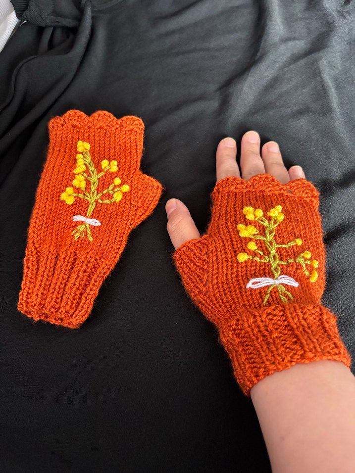 Renkli örgü ve sarı nakış detaylı, parmakları açık bohem kadın eldiveni.